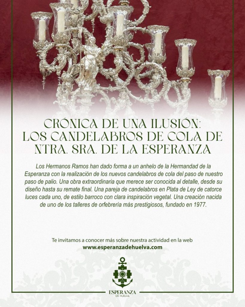 El próximo miércoles, día 12 de noviembre, a las 20:00 h., en el salón de actos de nuestra Casa de Hermandad, y dentro del ciclo ENCUENTROS EN LA ESPERANZA, tendrá lugar la Mesa Redonda bajo el título: “Crónica de una ilusión. Los Candelabros de cola de Ntra. Sra. de la Esperanza”.