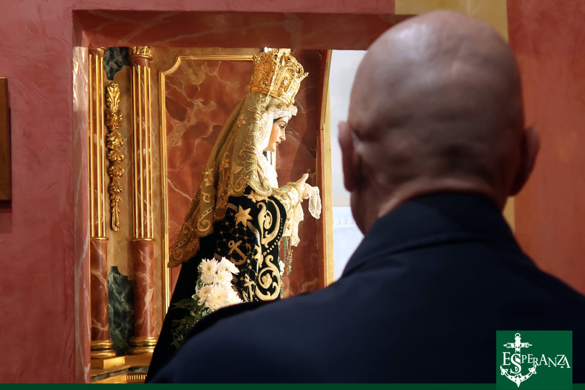 A su llegada, acompañado de su Teniente Hermano Mayor D. Guillermo Revuelta Casas, visitó nuestro Museo y dependencias, mostrando su admiración por nuestra Casa de Hermandad y conociendo más de cerca nuestra historia. En un momento de especial emoción, se postró ante nuestros Titulares en la iglesia, elevando una oración ante Nuestra Señora de la Esperanza Coronada.