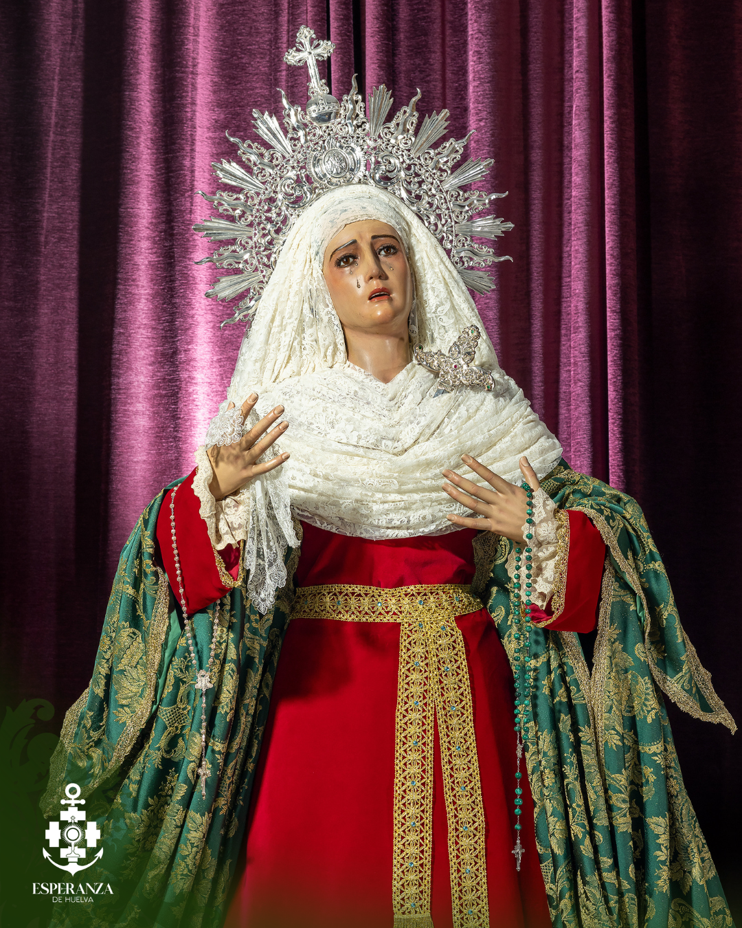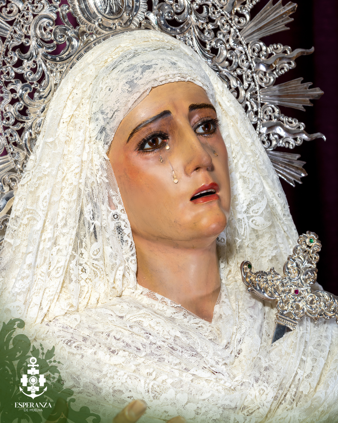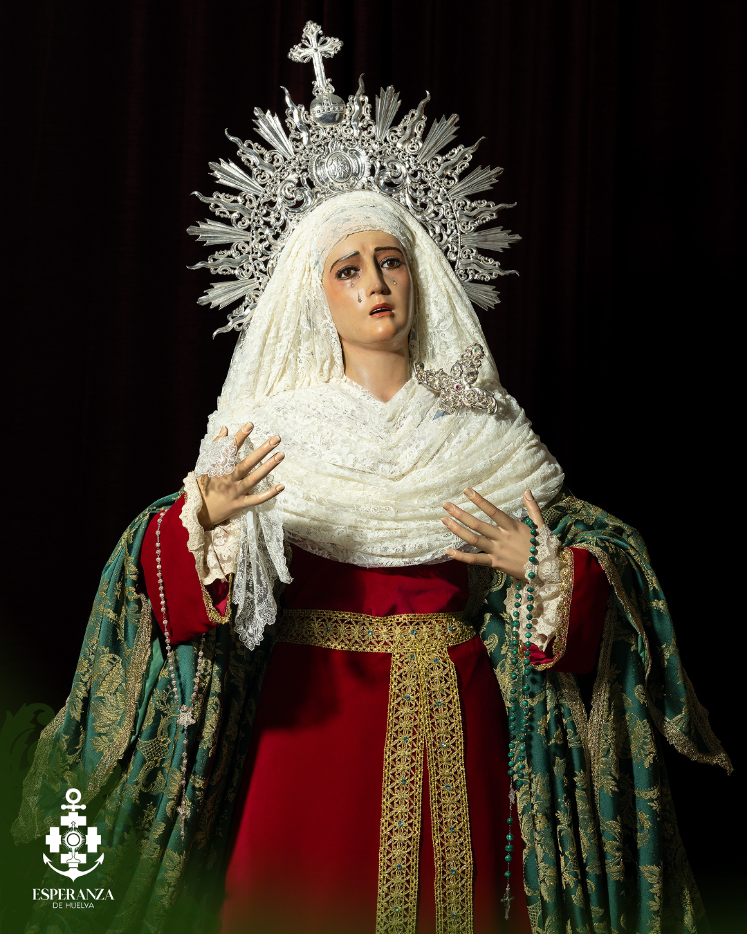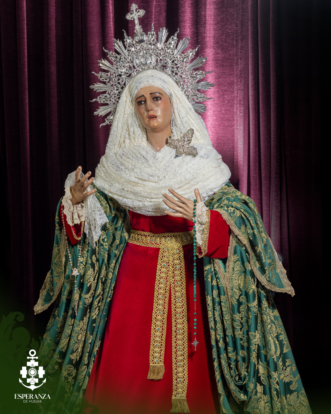 Así luce María Santísima del Mayor Dolor para el Tiempo de Pascua de Resurrección, ataviada por su vestidor D. José Fernández García.