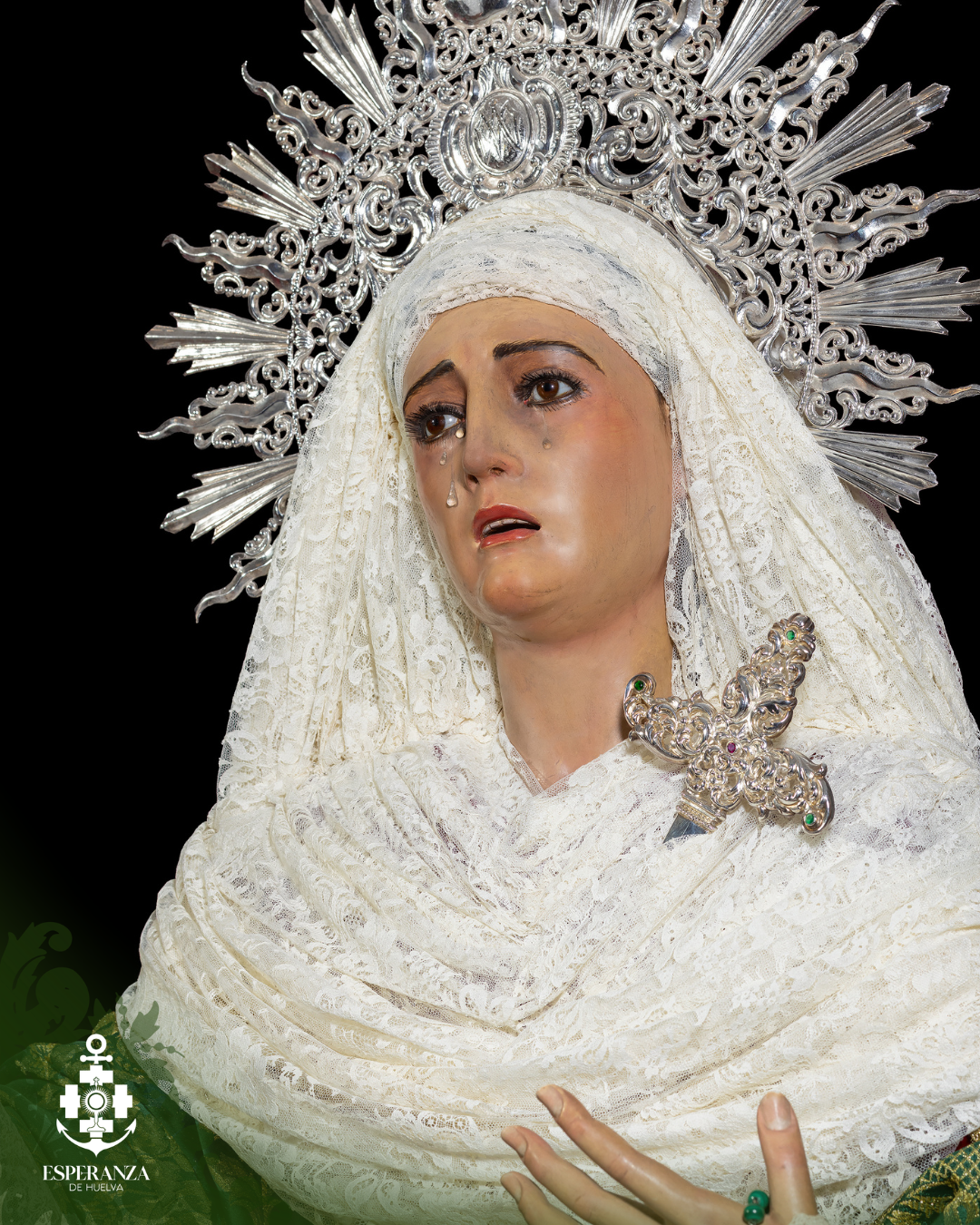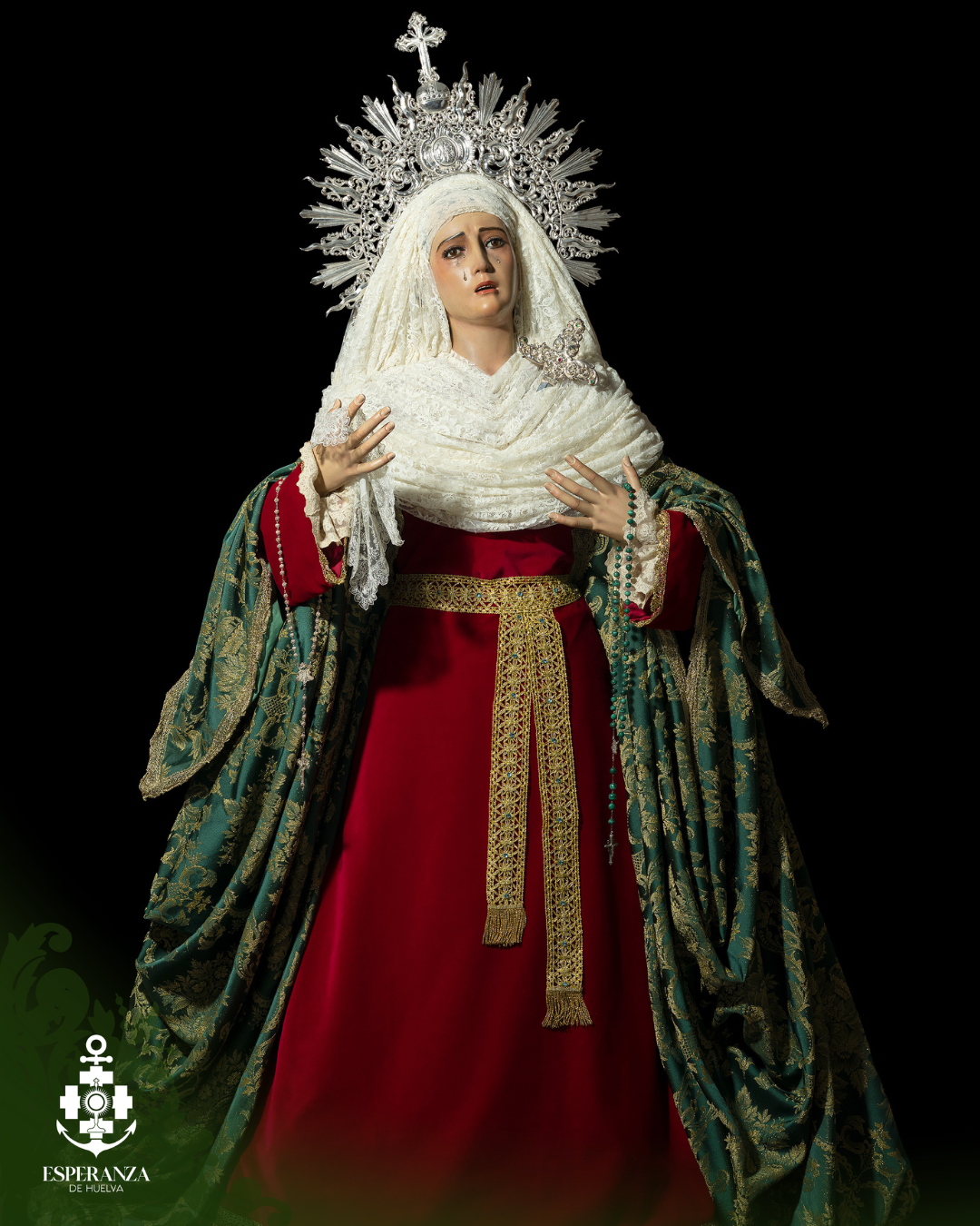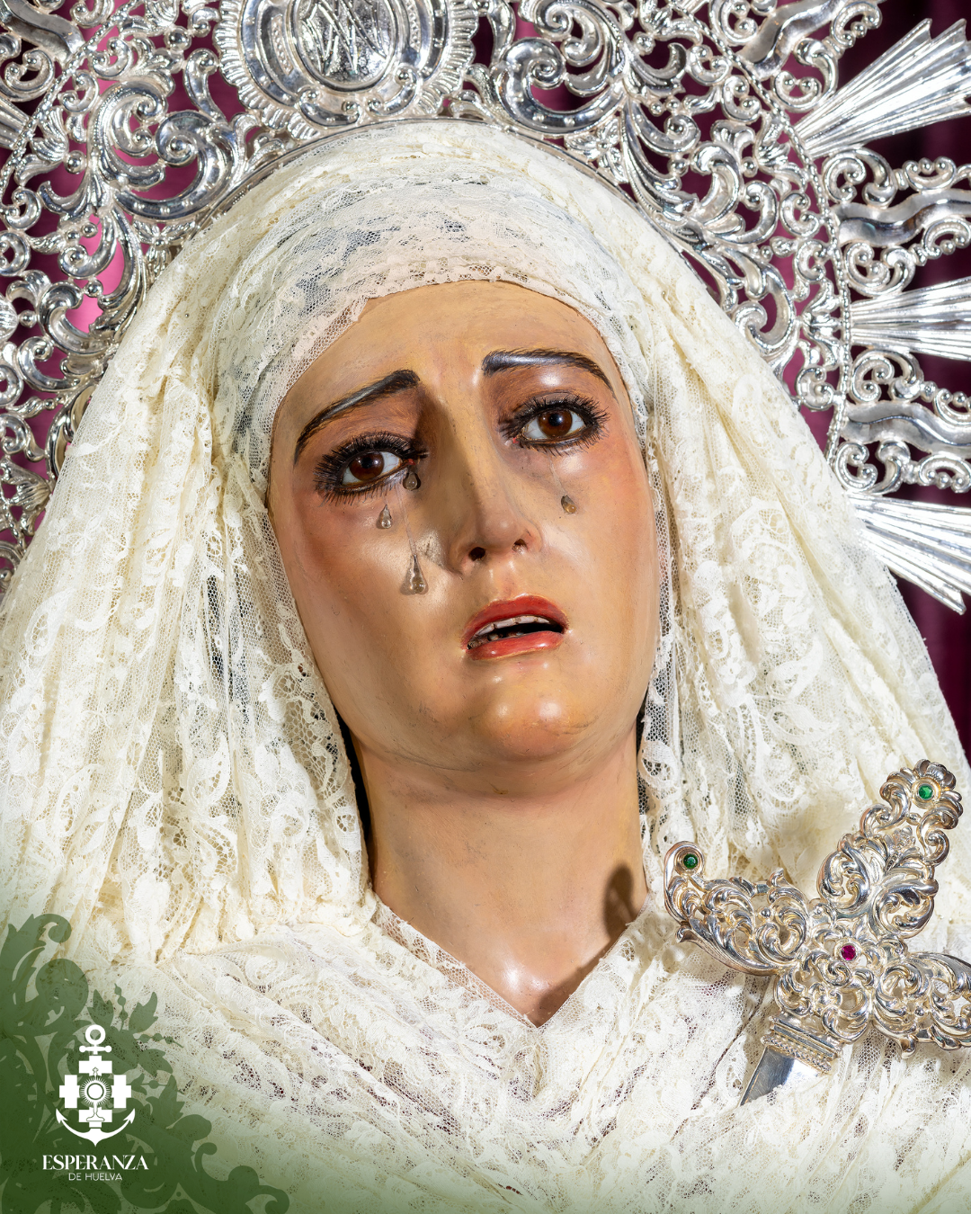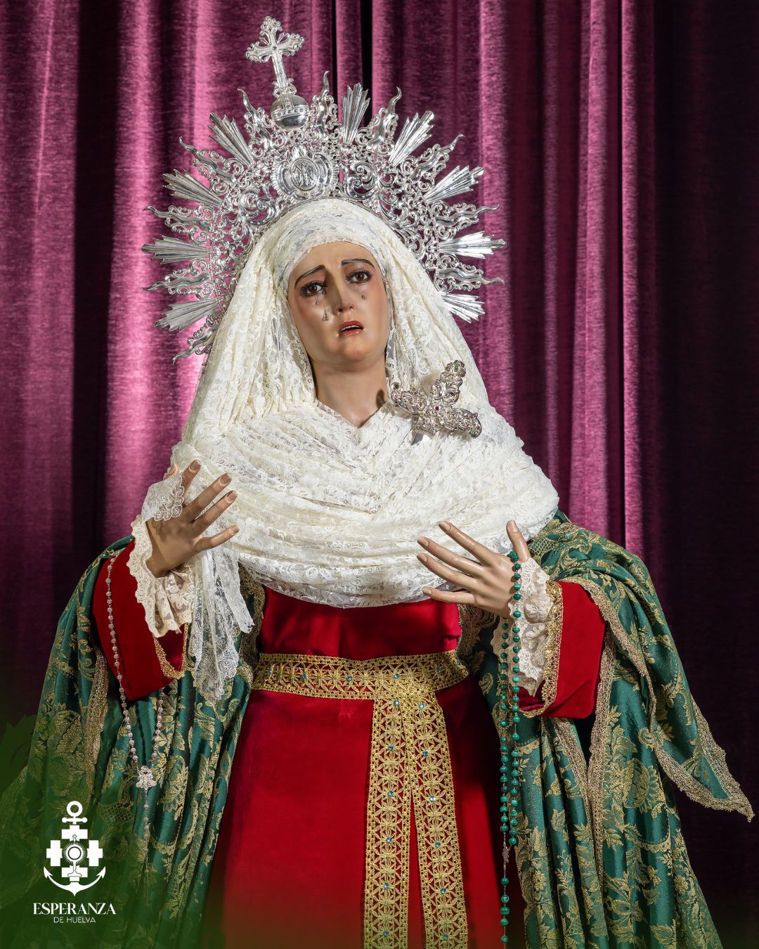 Así luce María Santísima del Mayor Dolor para el Tiempo de Pascua de Resurrección, ataviada por su vestidor D. José Fernández García.