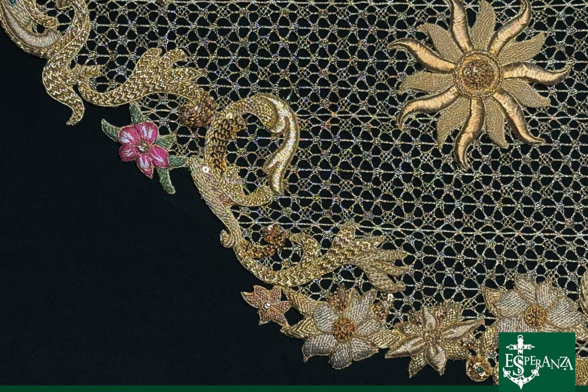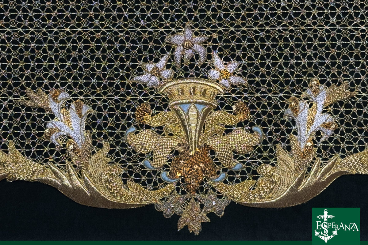 Las labores han consistido en la recuperación de los bordados originales, que han sido cuidadosamente desmontados, perfilados y realzados con espejuelos, mingos, lentejuelas y nuevos cordones que aportan luz y profundidad a cada motivo. Se han incorporado elementos nuevos ejecutados con técnica de cartulina y puntos tradicionales como cetillo, ladrillo, media onda y escamado de lentejuelas, logrando una nueva pieza que enriquece el ajuar de nuestra Madre.