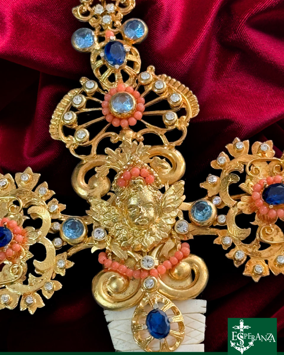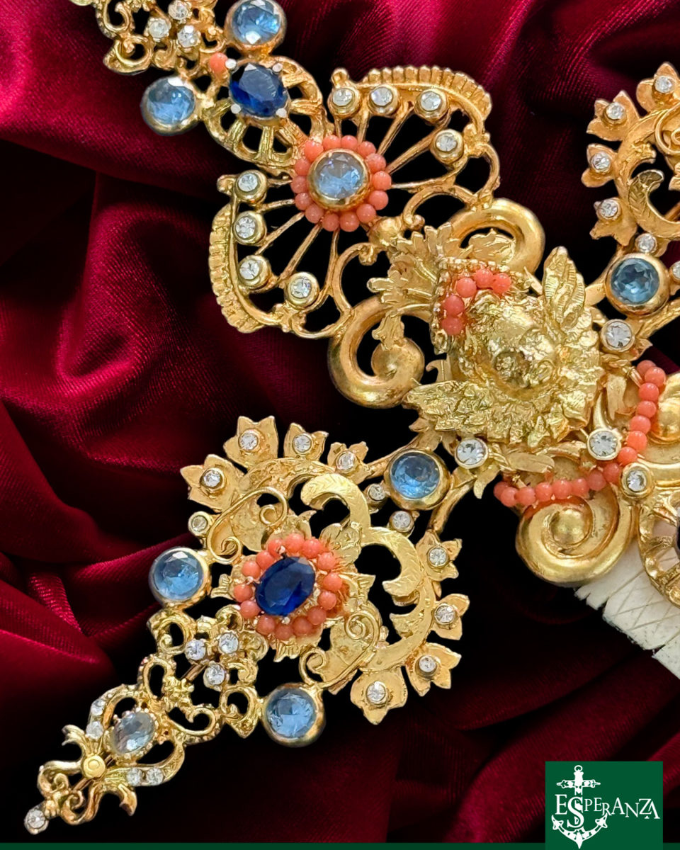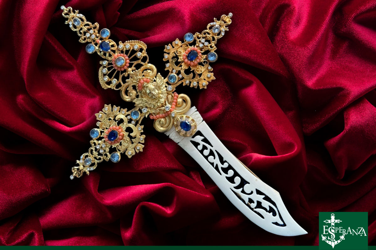 – Un puñal de decoración barroca, con querubín central tocado con diadema enriquecida con corales. Ha sido realizado por la Joyería El Toisón en plata de ley chapada en oro, enriquecido con corales finos, aguamarinas y espinelas, reflejo de la exquisitez y delicadeza hacia Nuestra Señora. La hoja está realizada, en singular y delicado hueso tallado.
