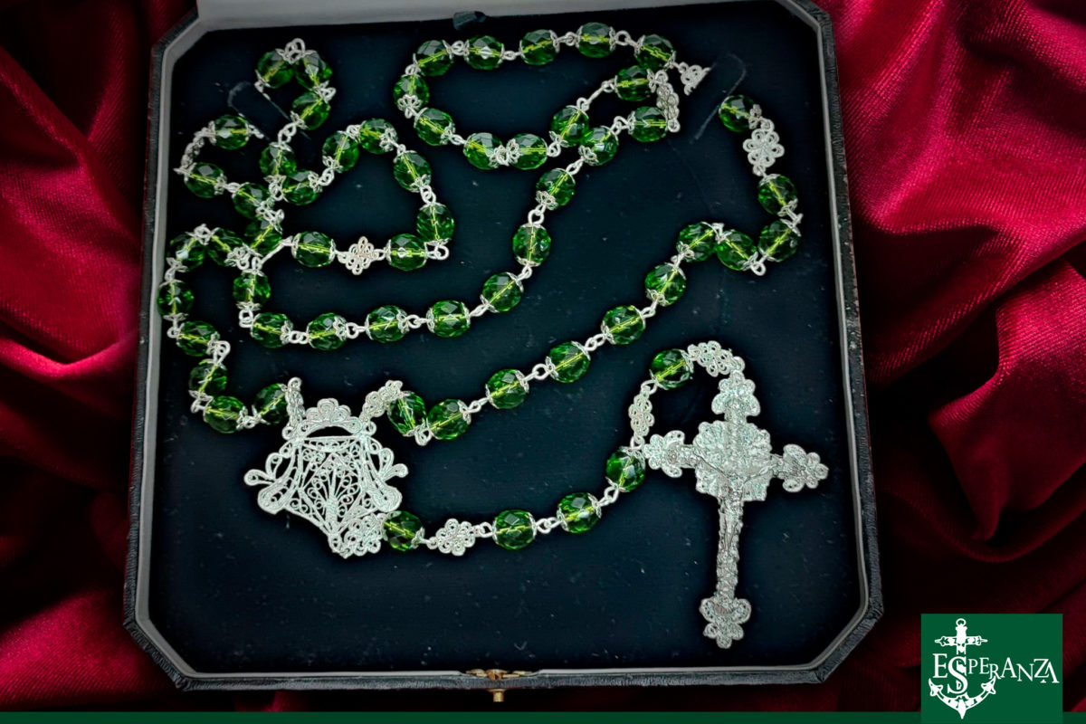 Por su parte, nuestro Sacristán, D. Francisco Díaz, y su señora, Dª Fina Domínguez, donaron un rosario confeccionado en cristal color verde oliva y filigrana de plata, símbolo de oración y devoción a los pies de la Virgen.