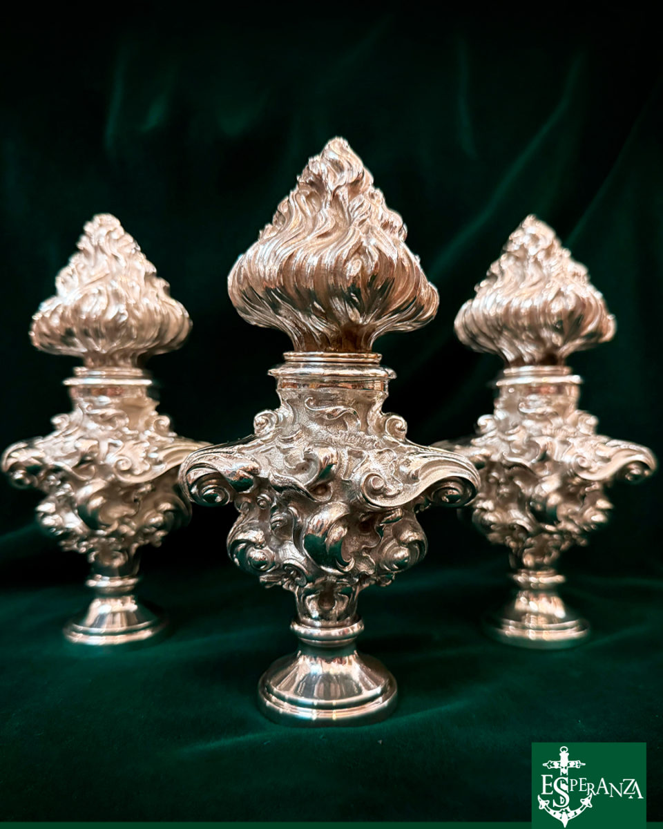 El diseño, de cuidada ejecución y profunda inspiración, ha sido realizado por Orfebrería Ramos, taller que también ha llevado a cabo su ejecución. Estas piezas, concebidas con motivo del XXV Aniversario de la Coronación Canónica, serán estrenadas, D.m., el próximo Miércoles Santo.