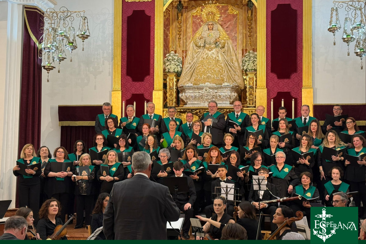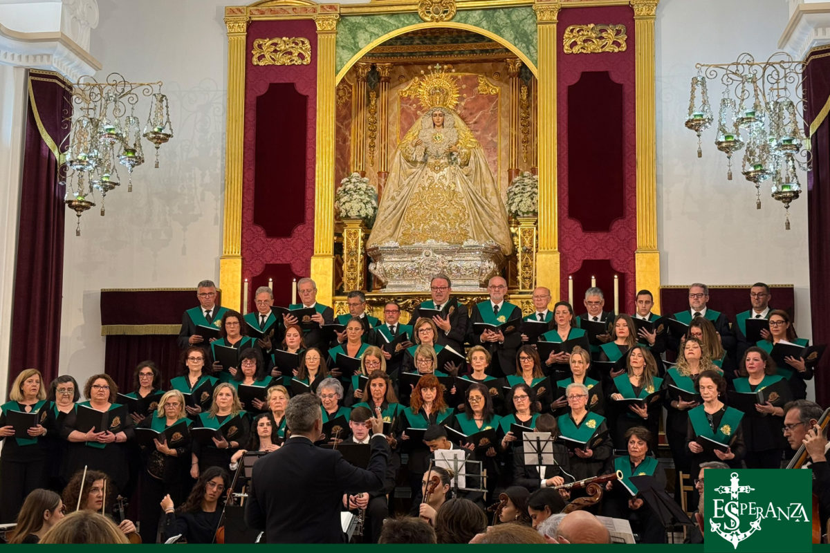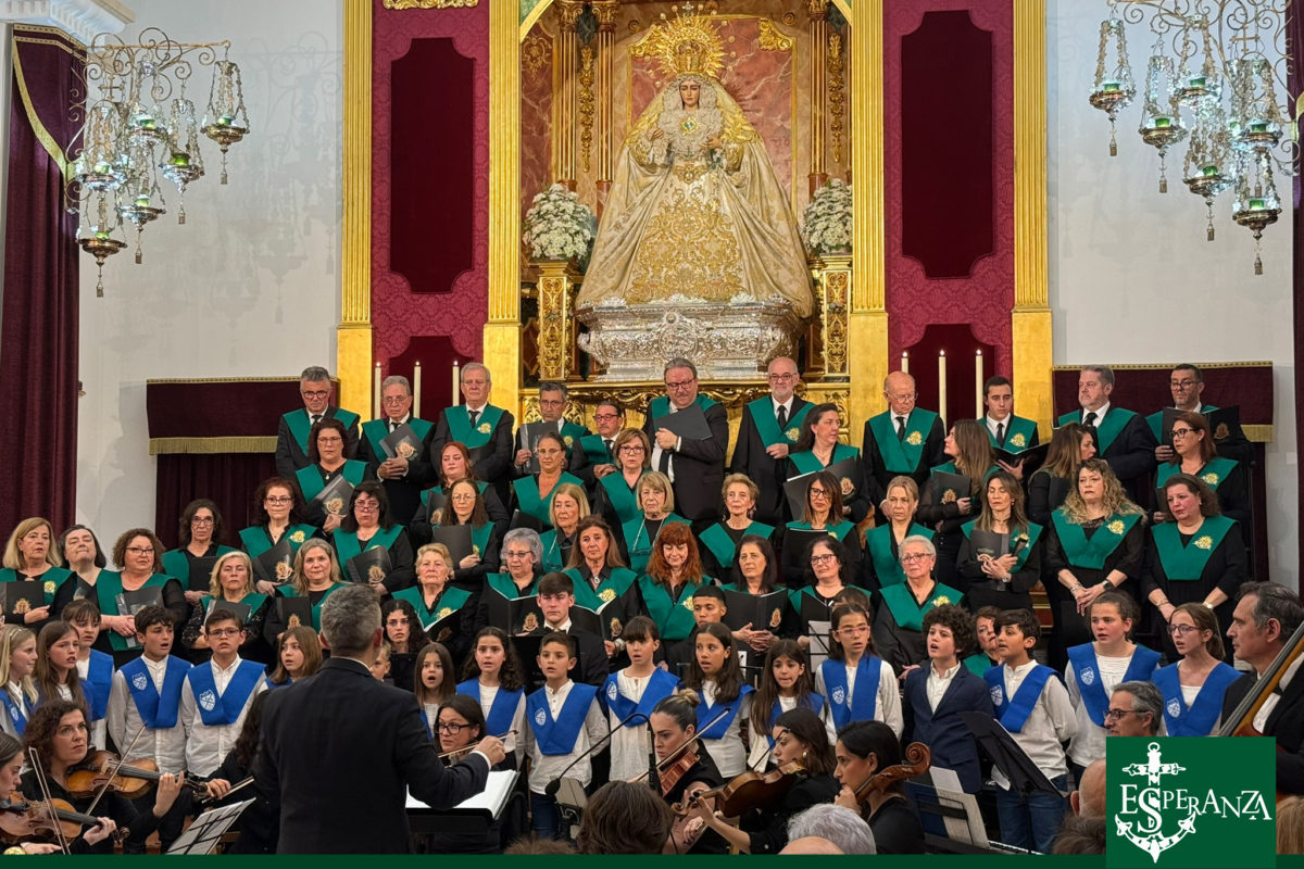Cada interpretación fue un canto sincero y elevado a la Virgen, pero hubo momentos que quedarán para siempre en el corazón de los presentes: la interpretación del Himno de la Coronación 25 años después, la Plegaria a Nuestra Señora de la Esperanza, la emotiva versión del Ave María de Pedro Braña, interpretada por el Coro de Voces Blancas, o la interpretación coral de Esperanza de Huelva, en la que el público se unió al canto, llenando el templo de un eco fraternal y devoto.