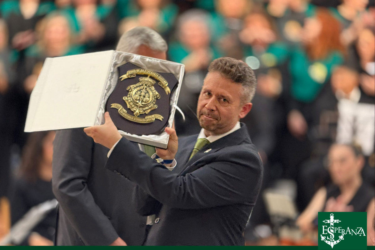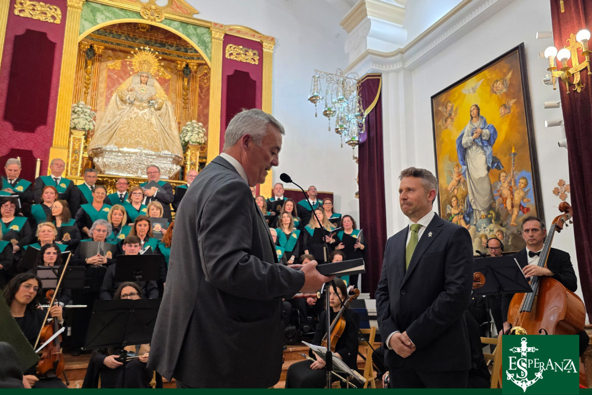 En un gesto de reconocimiento, el Hermano Mayor, José Manuel Mora Soler, dirigió unas palabras de profundo agradecimiento a la Coral, calificando esta Ofrenda como un verdadero regalo a la Virgen y a toda la Hermandad. Como testimonio de gratitud, hizo entrega de la metopa conmemorativa del XXV Aniversario al director de la Coral, N.H.D. David López Jiménez, cuya entrega, dedicación y sensibilidad musical han sido claves en el éxito de esta cita tan significativa.