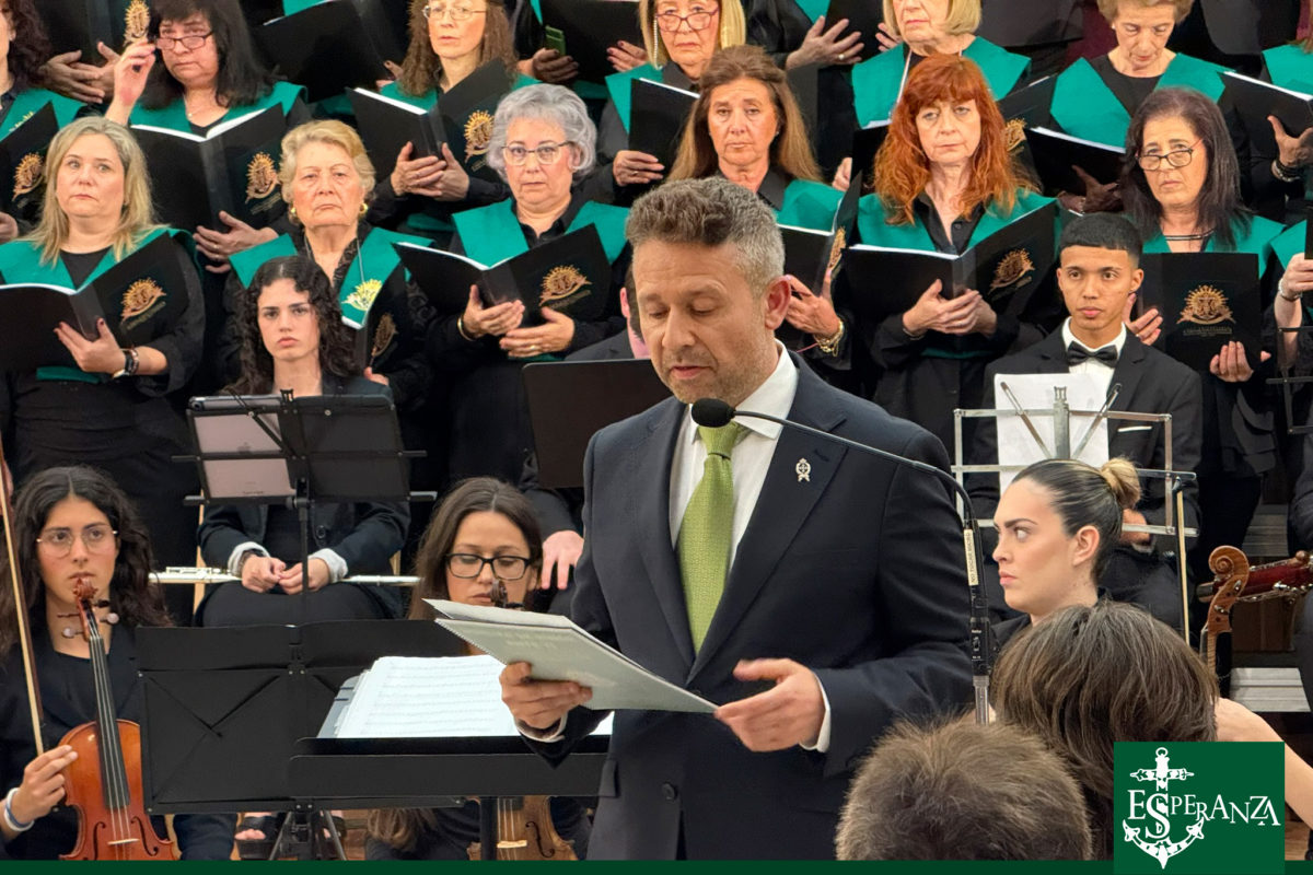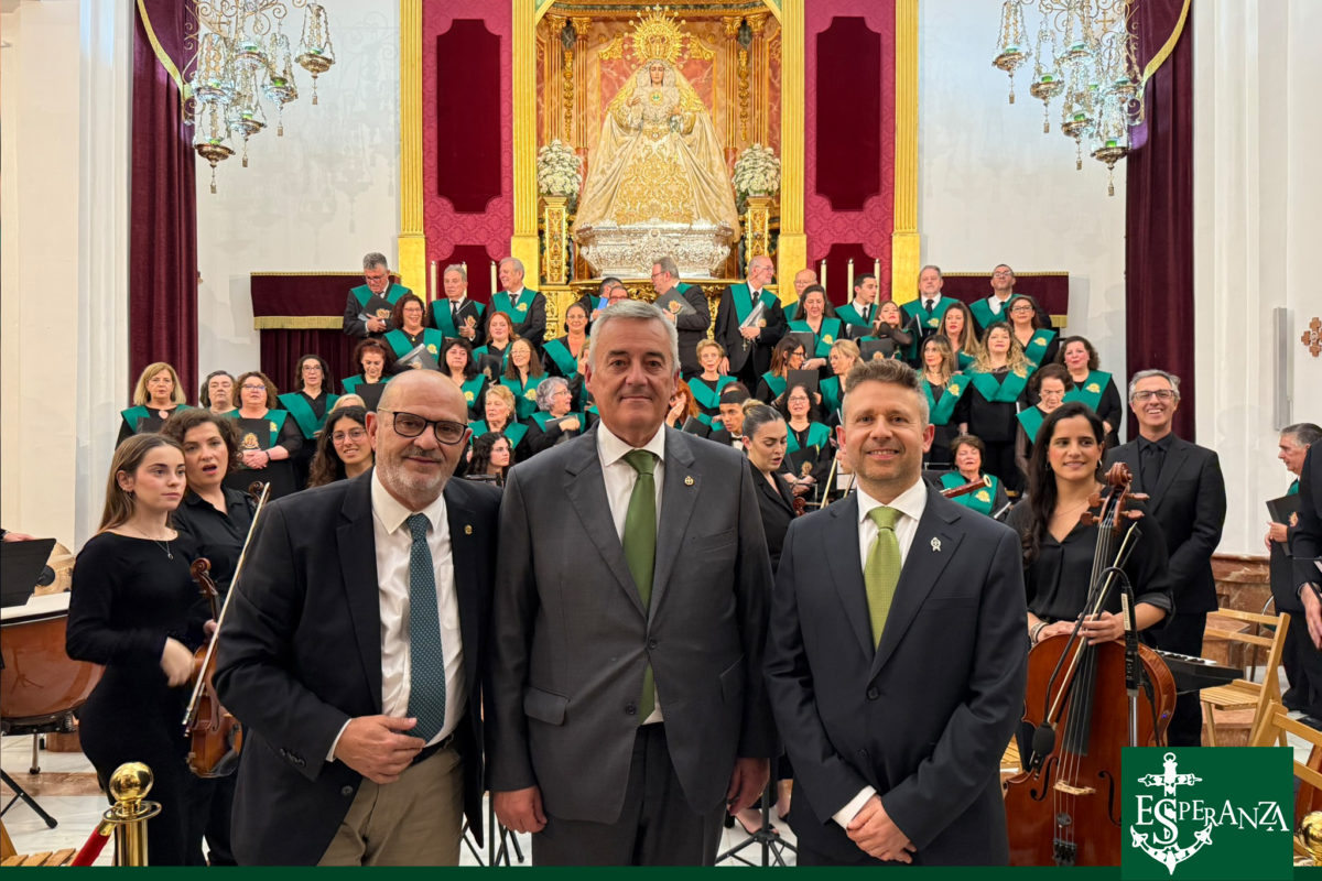 La Coral Santa María de la Esperanza, acompañada por la Orquesta Colombina Onubense, el Coro de Voces Blancas del Colegio Público Prácticas, el solista Pablo Arazo y el organista Jesús Campos Gálvez, bajo la dirección de N.H.D. David López Jiménez, ofreció un extenso y cuidado programa musical compuesto por dieciséis piezas, entre las que se incluyó el estreno absoluto del Himno del XXV Aniversario de la Coronación Canónica “Huelva se rinde ante Ti”, interpretado nuevamente al cierre del acto ante la ovación del público y la presencia de quién ha escrito la letra con tanta sensibilidad N.H.D. Jesús Flichi Redondo.