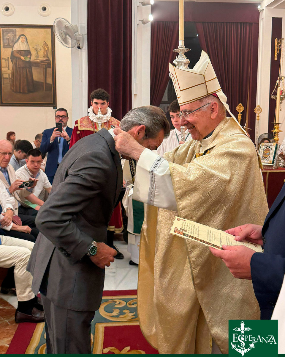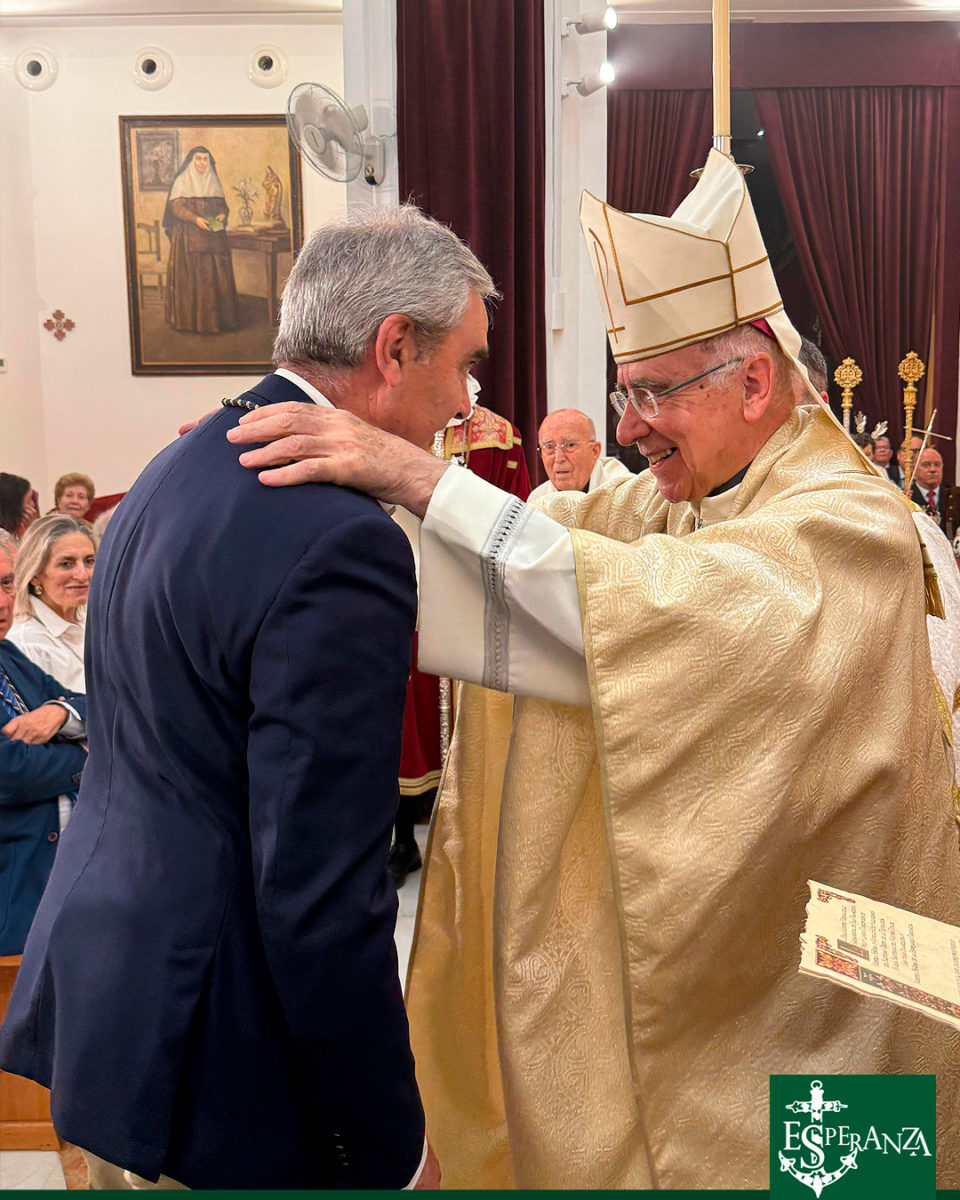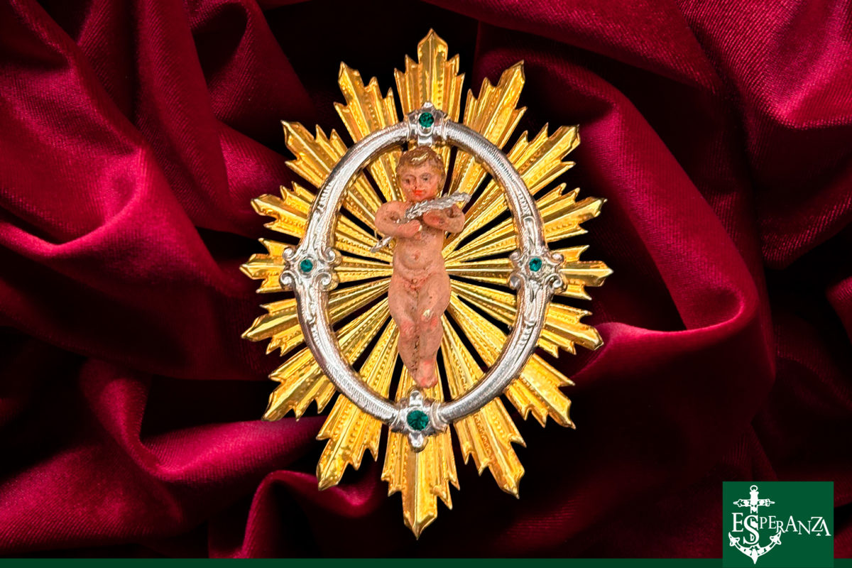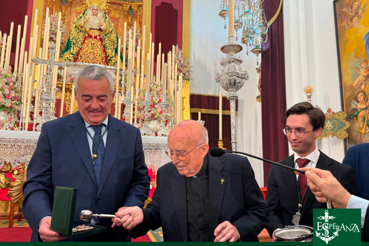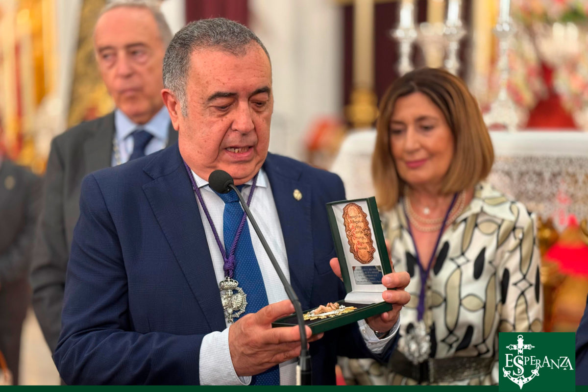 Seguidamente, y en un gesto que evocó años de hermandad y camino compartido, la Hermandad del Nazareno entregó un presente cargado de simbolismo y profundidad teológica: un broche en forma de la letra “O”, realizado en plata, en su color, y dorado por los Hermanos Ramos. En su centro, una delicada miniatura del Niño Dios irradia el sentido de la Expectación, misterio que da origen a la advocación de la Esperanza. El broche evoca las siete antífonas del Adviento —“O Sapientia, O Adonai, O Radix Jesse…”— que durante siglos han resonado en la liturgia de la Iglesia anunciando la venida del Salvador. La dedicatoria que lo acompaña, firmada en este Año Jubilar de la Esperanza, testimonia el vínculo indisoluble entre nuestras dos Hermandades, nacido en tiempos de cercanía física y afianzado por el amor compartido a Cristo y a su Madre Santísima.