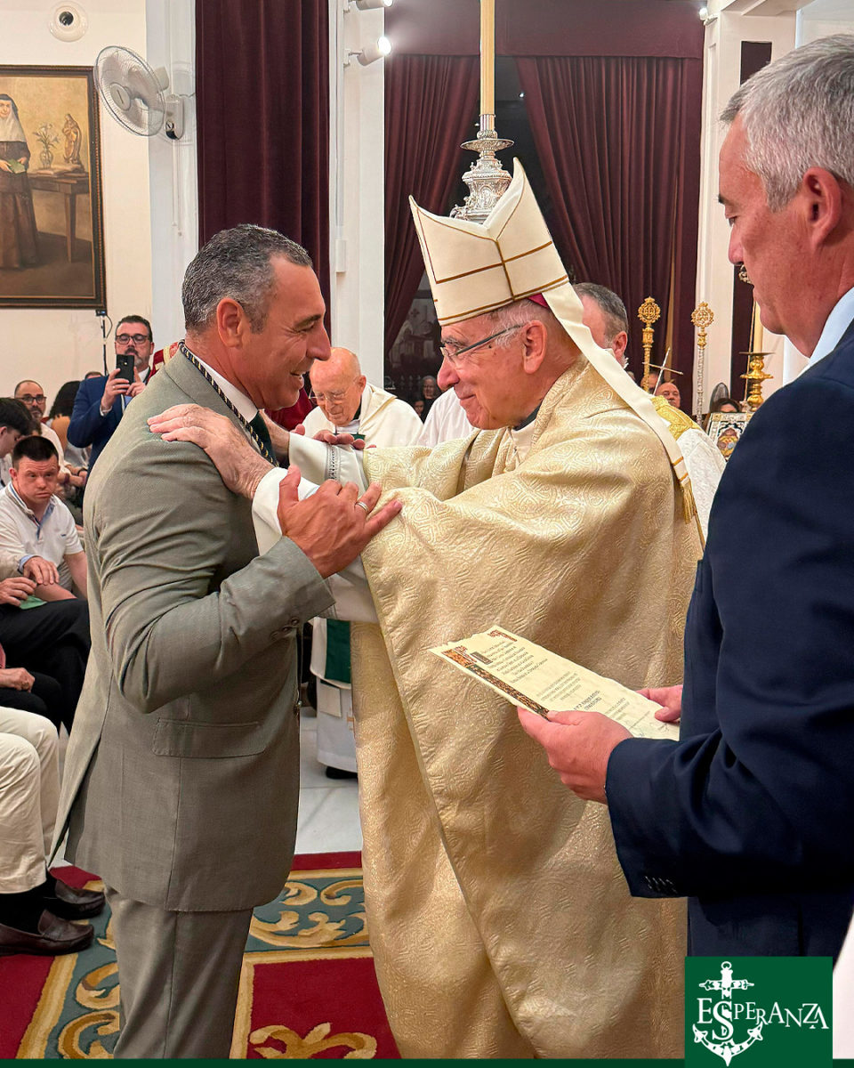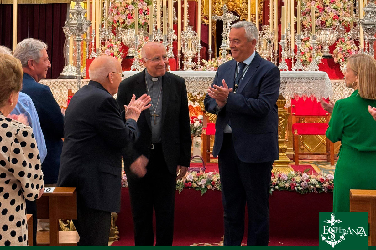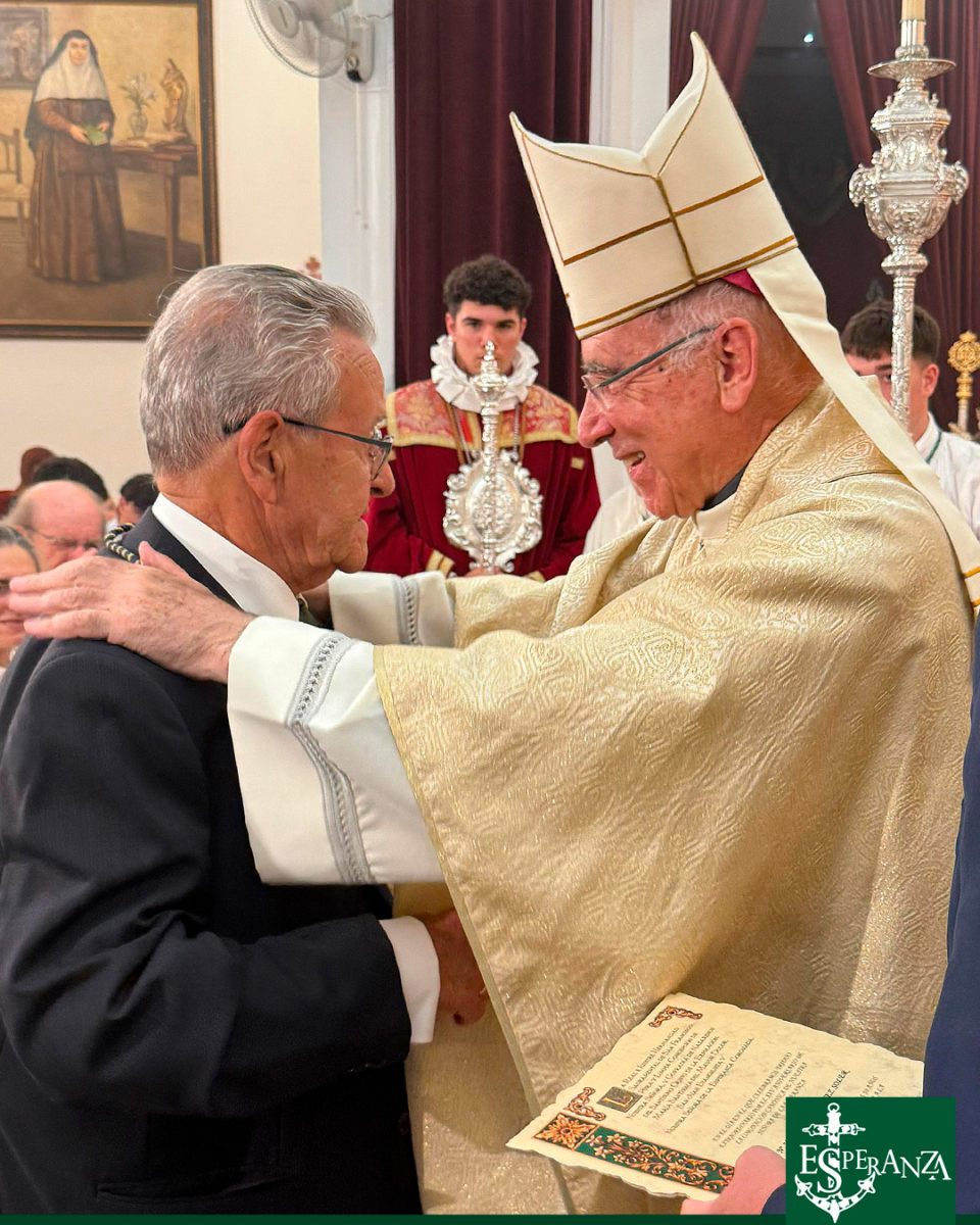 Al término de la Sagrada Eucaristía, la Hermandad vivió uno de los momentos más entrañables del triduo: la imposición de las medallas conmemorativas a los hermanos y hermanas que han cumplido cincuenta años de pertenencia a esta corporación. Uno a uno, fueron llamados quienes, con constancia, amor y entrega, han sostenido con sus vidas el testimonio de una fe compartida. Fue un acto sencillo, pero cargado de significación, que unió generaciones y dejó patente el sentido de continuidad, herencia y fidelidad que define la historia de nuestra Hermandad.