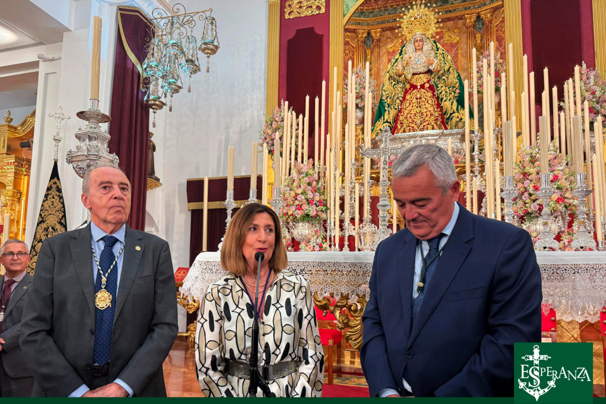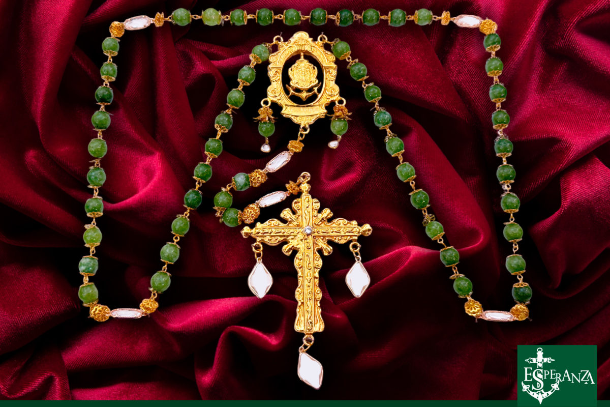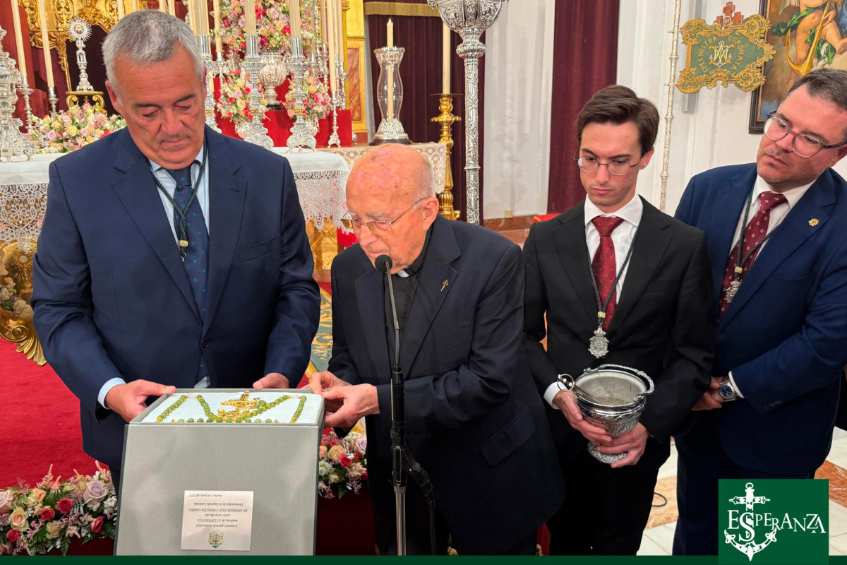 Pero la noche aún guardaba nuevos gestos de fraternidad y belleza. Nuestra Amantísima Titular, Nuestra Señora de la Esperanza Coronada, recibió dos preciosas ofrendas que simbolizan los profundos lazos que nos unen con otras importantes Hermandades de nuestra ciudad. La Hermandad de la Sagrada Lanzada, la cual tenemos el honor de ser su madrina, representada por su Junta de Gobierno y encabezada por su Hermano Mayor, hizo entrega de un delicadísimo rosario de piedras verdes, realizado con exquisitez por el vestidor de Nuestra Señora de los Dolores, Alejandro Navarro Benzal. Esta ofrenda fue recibida con sincero agradecimiento y quedará como recuerdo eterno de este Aniversario tan significativo.