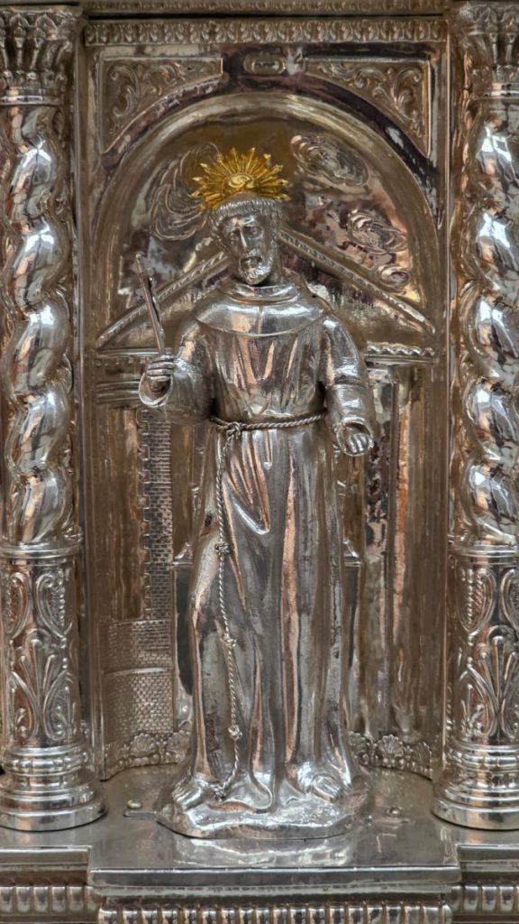 Hasta aquí podría terminar nuestra visita, pero, en el paso de Nuestra Señora de la Esperanza, en su costero izquierdo, se puede contemplar en el respiradero, la figura de San Francisco de Asís. Unos respiraderos de 1983 realizados en el Taller de Orfebrería de la Viuda de Villarreal. Esta imagen de San Francisco tiene como fondo la antigua Iglesia de San Francisco.