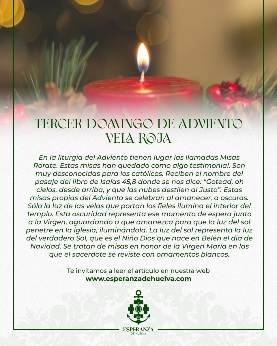 En la liturgia del Adviento, tienen lugar las llamadas Misas Rorate. Estas misas, muy en desuso, que, actualmente han quedado como algo testimonial, son muy desconocida para los católicos. Reciben el nombre del pasaje del libro de Isaías 45,8 donde se nos dice “Gotead, oh cielos, desde arriba, y que las nubes destilen al Justo”. Estas misas propias del Adviento, se celebran al amanecer, a oscura. Sólo la luz de las velas, que portan los fieles, ilumina el interior del templo. Esta oscuridad representa, ese momento de espera junto a la Virgen, aguardando a que amanezca, para que, la luz del sol penetre en la iglesia, iluminándola. La luz del sol, representa la luz del verdadero Sol, que es el Niño Dios que nace en Belén, el día de Navidad. Se tratan de misas en honor de la Virgen María en las que, el sacerdote se reviste con ornamentos blancos.